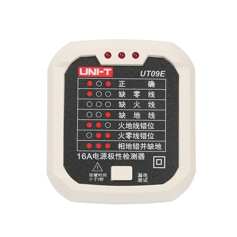 16A插头设计,专门用于额定电流为16A的插座(一般为空调专用)检测;人性化凹槽设计,当需要插入插座检测电路时,为用户带来更安全的插拔体验,有效避免在插拔时指不慎接触金属插头,提高安全系数。 - 具备漏电测试功能
